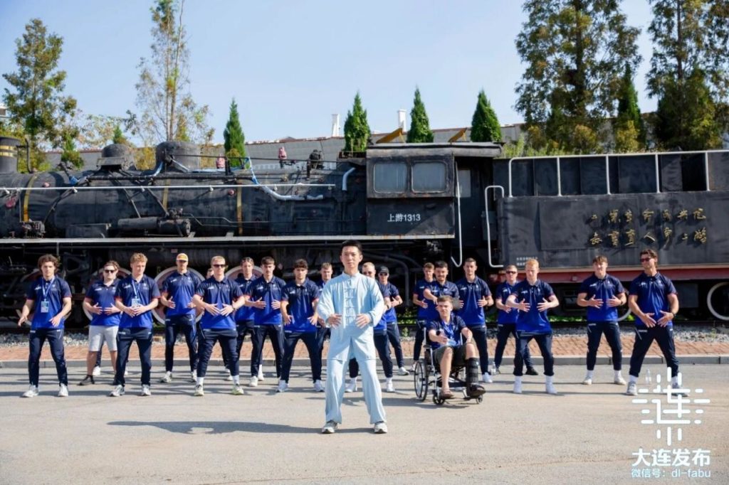 The team toured the campus’s “Shangyou” steam locomotive—donated by alumni in 2006 and now a beloved cultural landmark where graduates traditionally take commemorative photos. Nearby, a coach in traditional Chinese attire led the players in an immersive session of Baduanjin, a classic qigong practice.